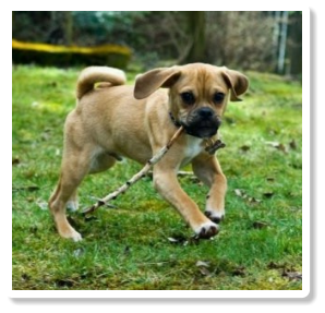 happy and smart Puggle who loves kids